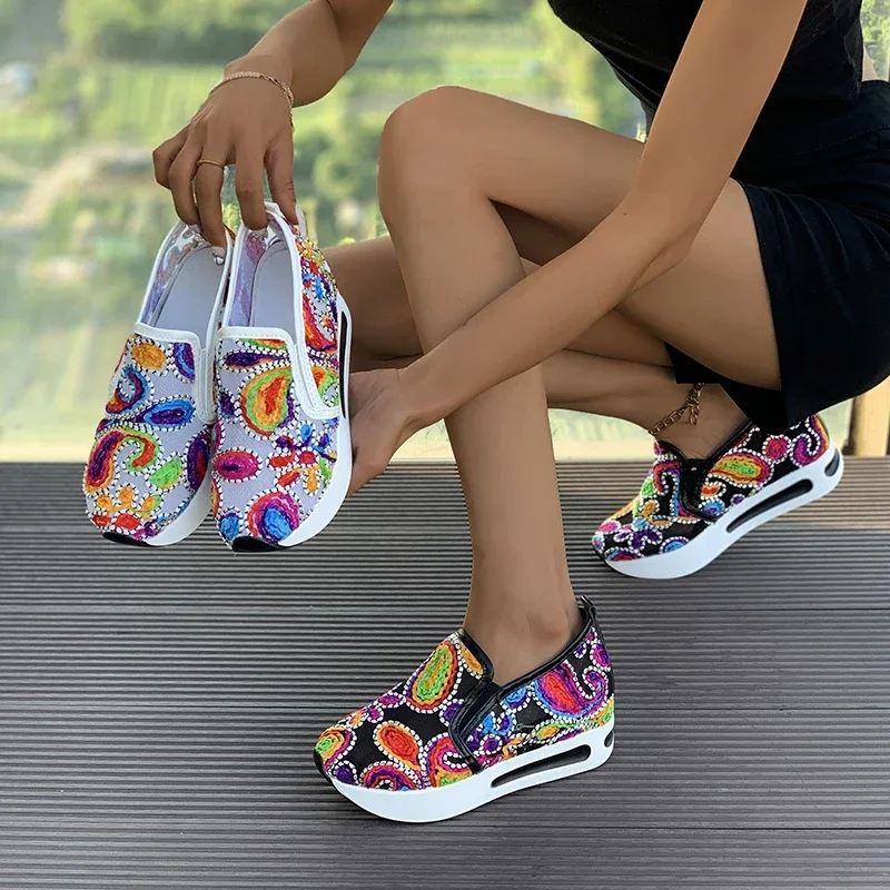 Women’s Wedge Shoes New Spring Autumn Fashion Round Toe Floral Pattern Embroidery Mesh Platform Sneakers Increase Height Shoes